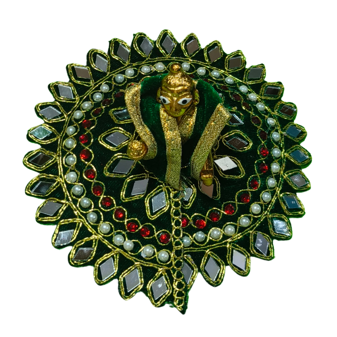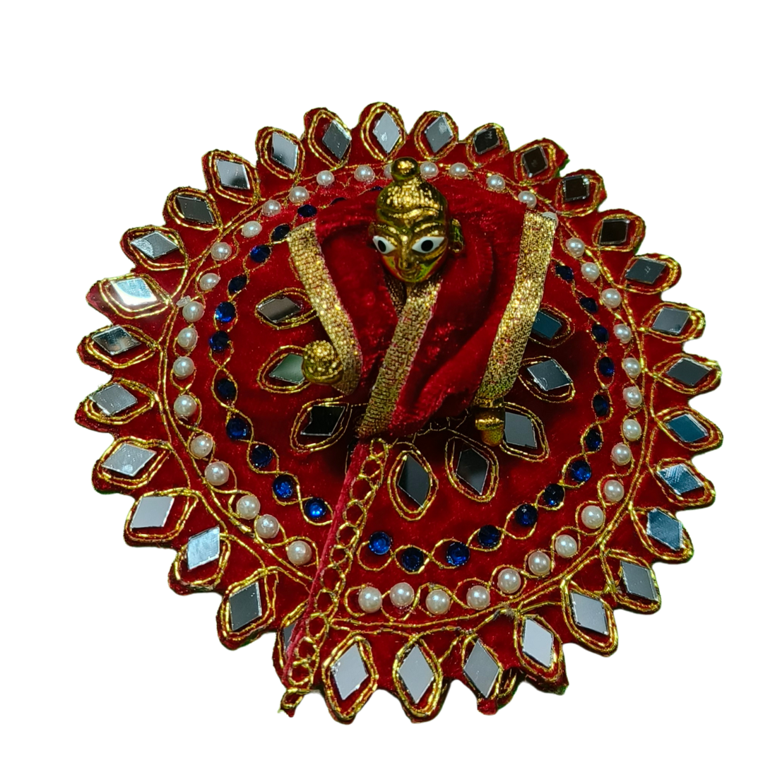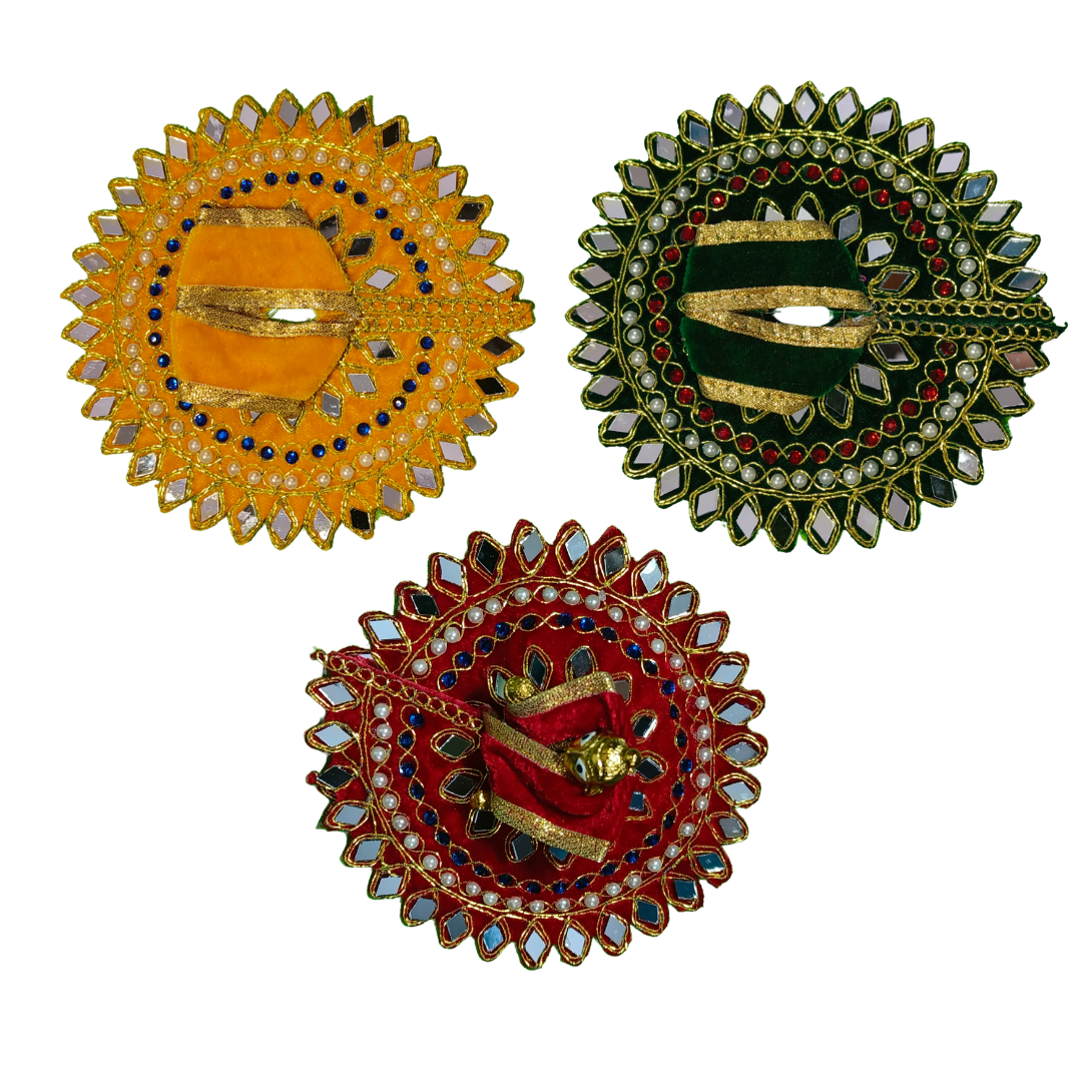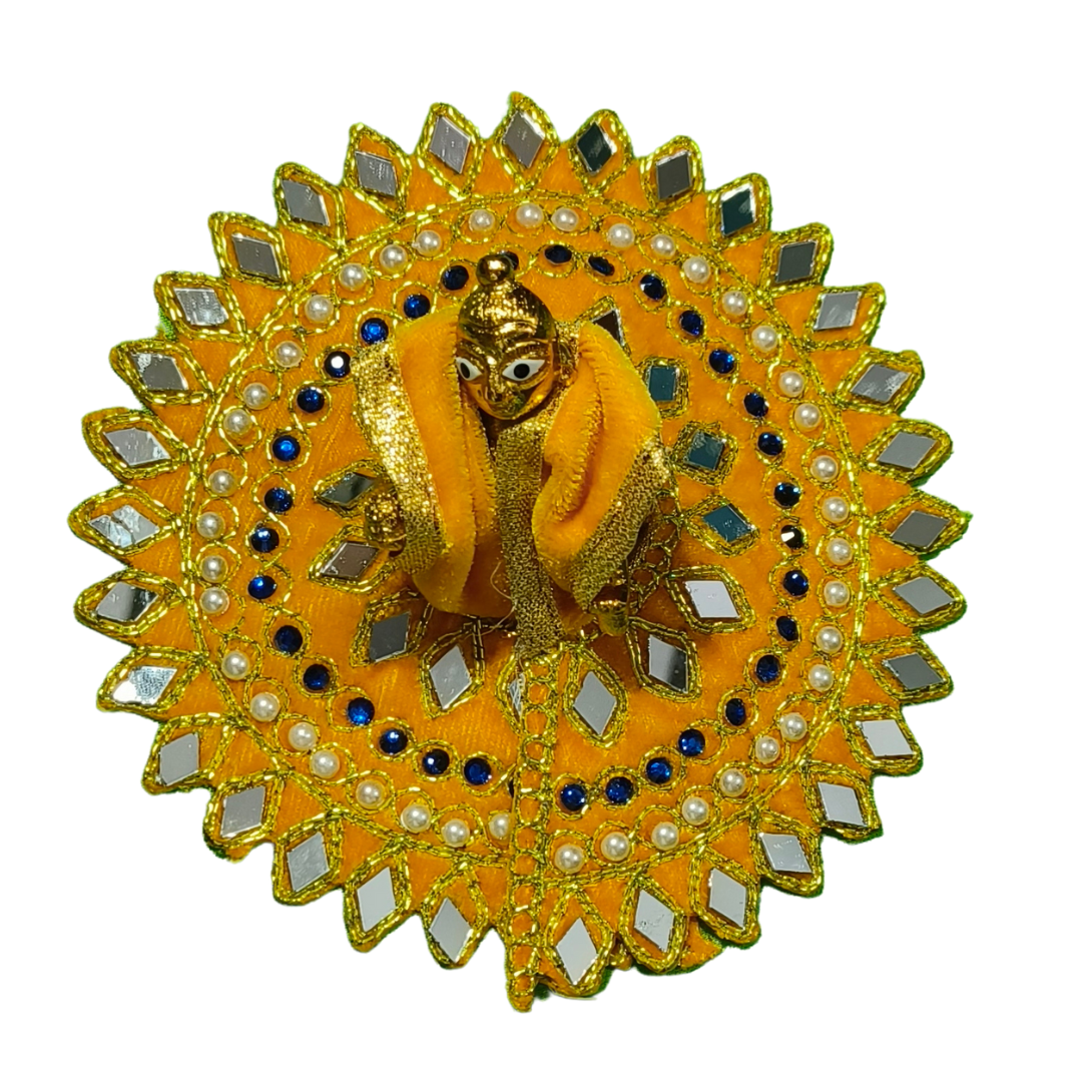 Enhance your home temple with this elegant and royal Laddu Gopal dress set crafted with premium velvet fabric and surrounded by a beautifully designed circular aasan. The intricate mirror work, pearl detailing, colorful stones, and golden lace borders create a divine and festive look for your beloved Kanha Ji.